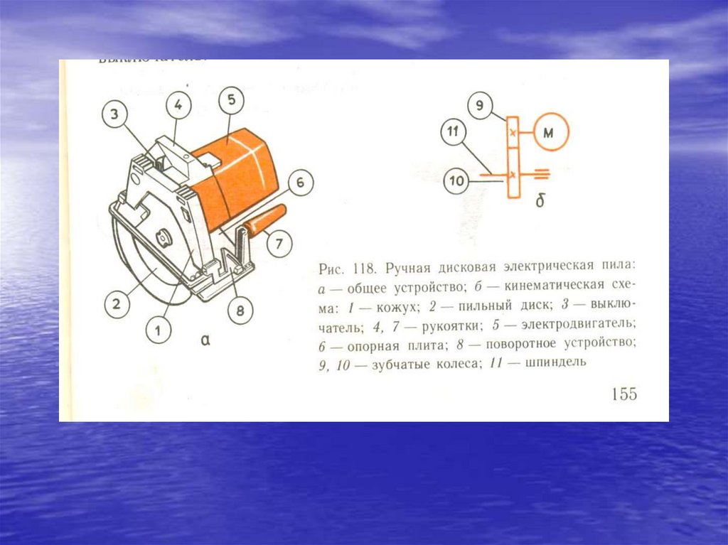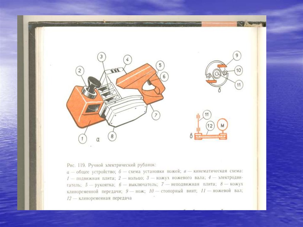 6. Ручные электрические рубанки предназначены для строгания древесины вдоль волокон. Режущим инструментом являются плоские