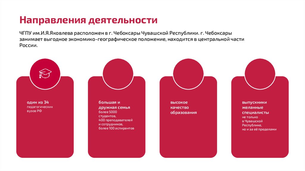 Направления деятельностиЧГПУ им.И.Я.Яковлева расположен в г. Чебоксары Чувашской Республики. г. Чебоксары