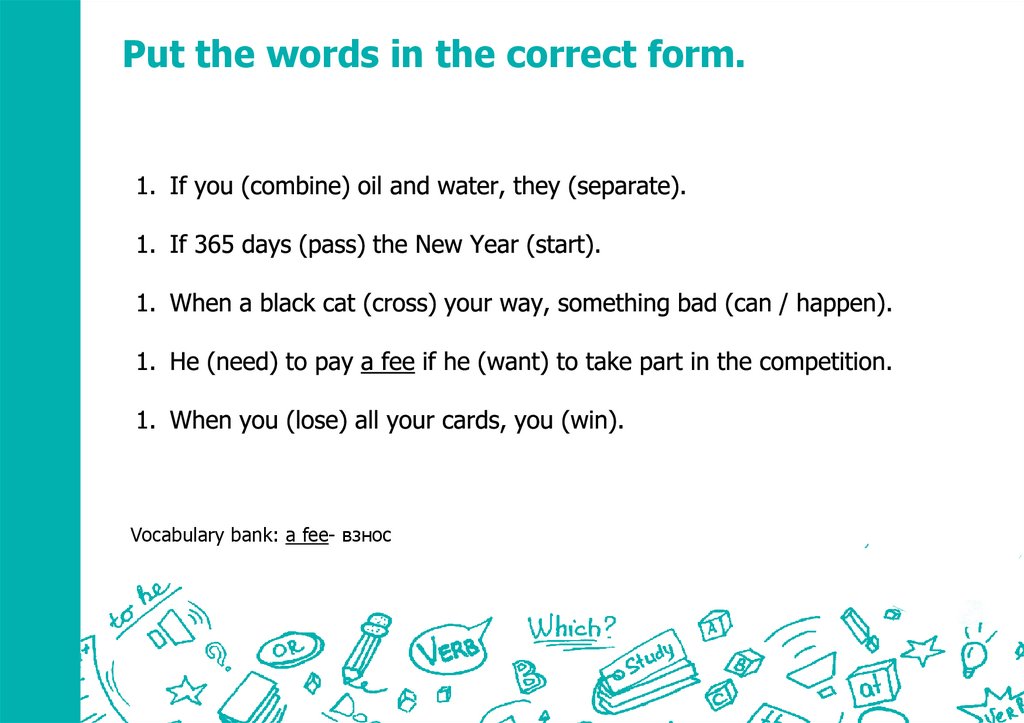 Put the words in the correct form.Vocabulary bank: a fee- взнос