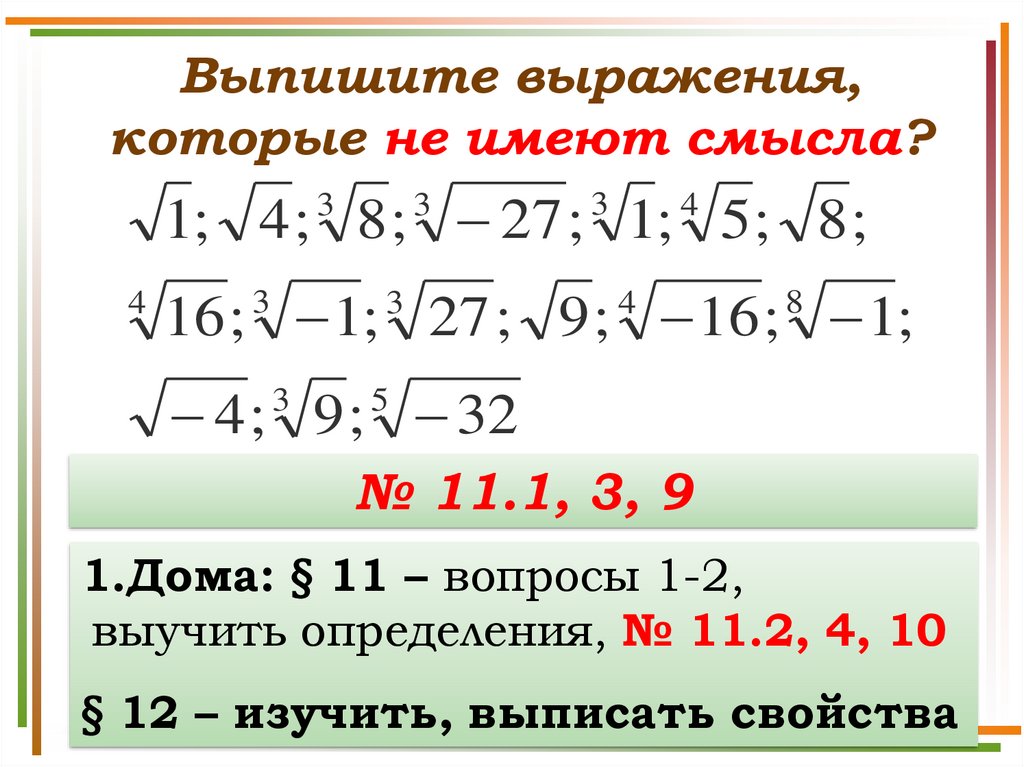 • Корень четной степени имеетсмысл (т.е. определен) только