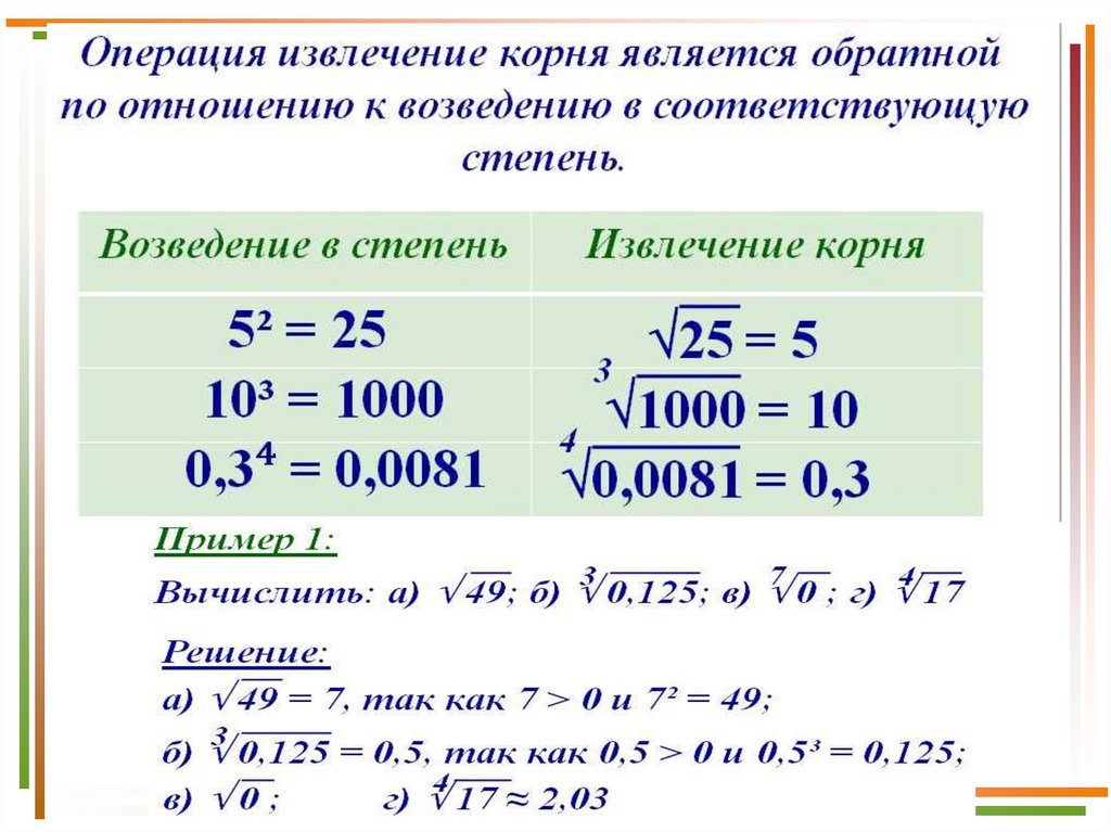 Арифметическим корнем n-й степенииз неотрицательного числа а (n = 2, 3, 4, 5,