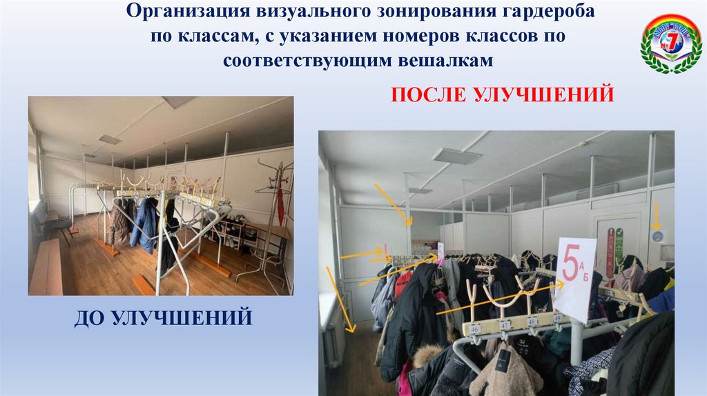 Организация визуального зонирования гардеробапо классам, с указанием номеров классов по