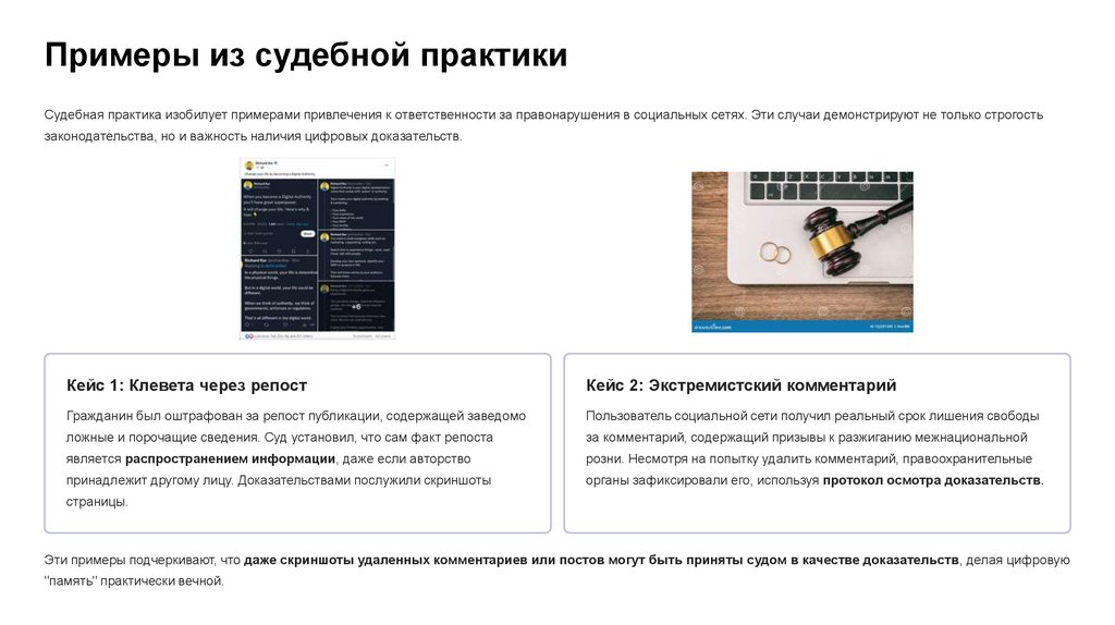 Эти примеры подчеркивают, что даже скриншоты удаленных комментариев или постов могут быть приняты судом в качестве доказательств, делая цифровую