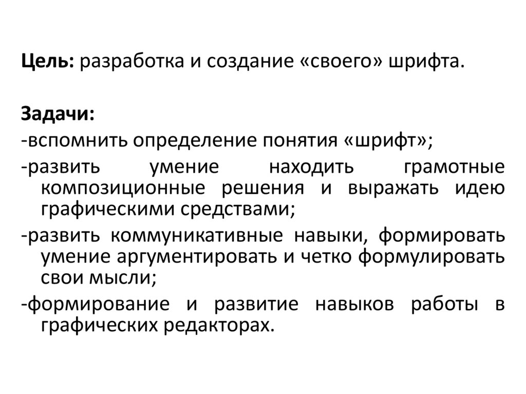 Цель: разработка и создание «своего» шрифта.Задачи: