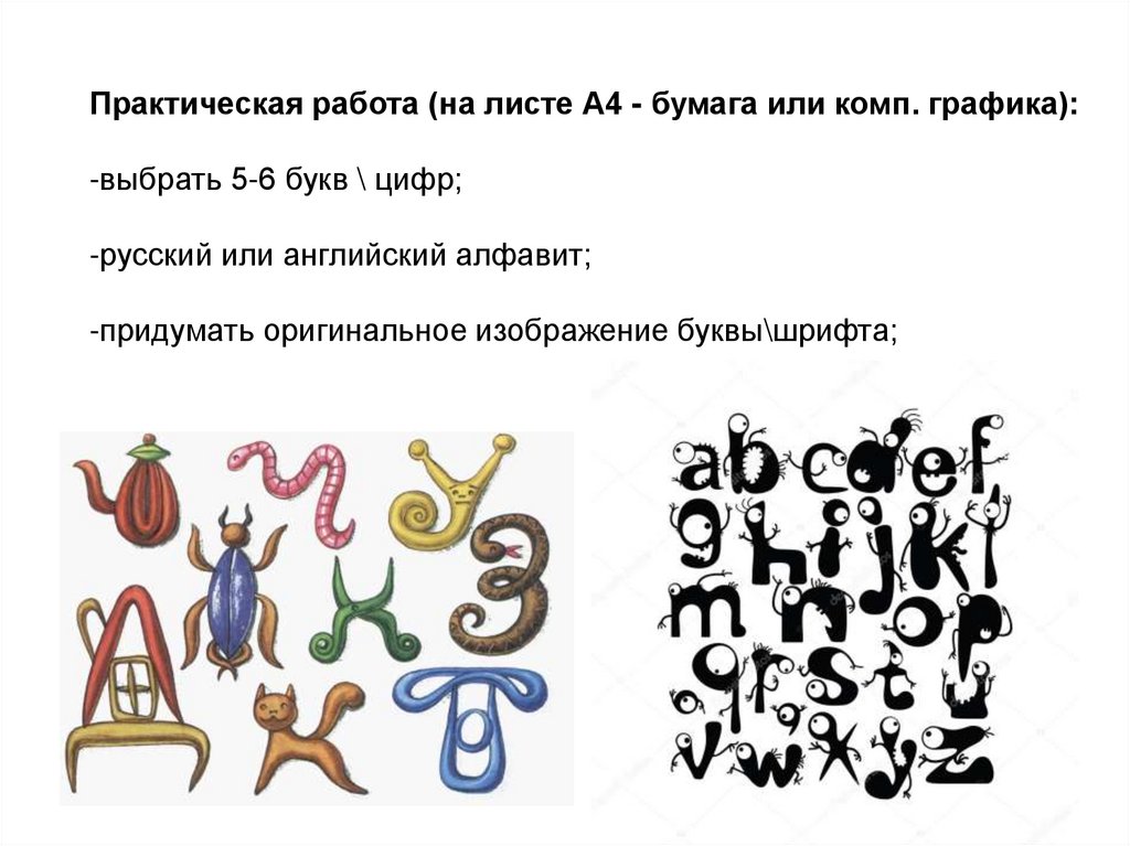 Практическая работа (на листе А4 - бумага или комп. графика):-выбрать 5-6 букв \ цифр;