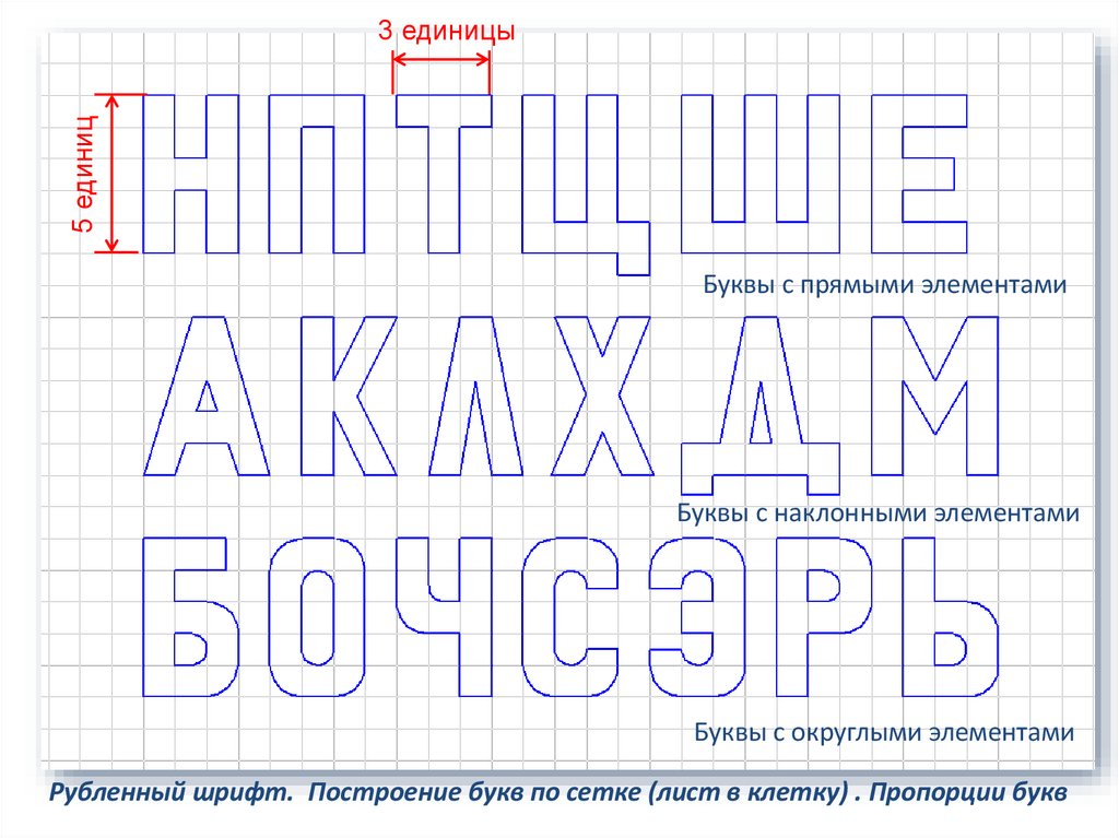 Рубленный шрифт. Построение букв по сетке (лист в клетку) . Пропорции букв
