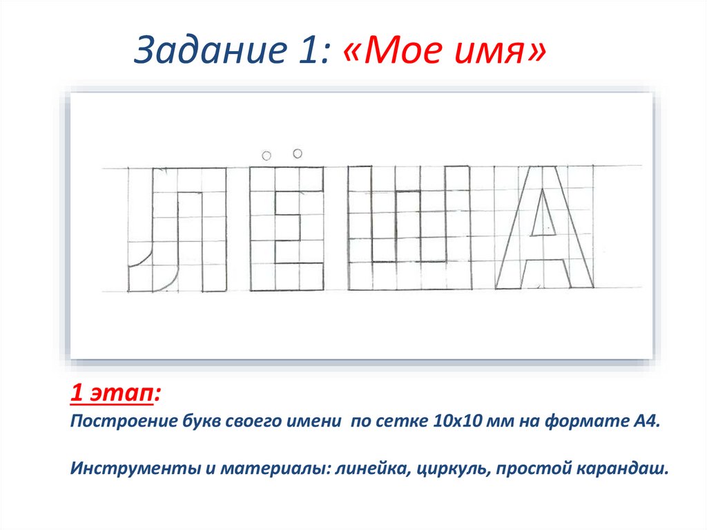 Построение букв своего имени по сетке 10х10 мм на формате А4.