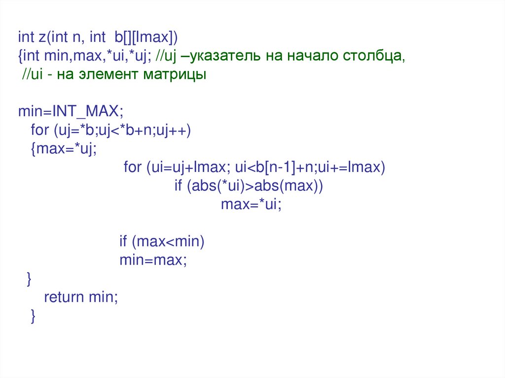 int z(int n, int b[][lmax]){int min,max,*ui,*uj; //uj –указатель на начало столбца,