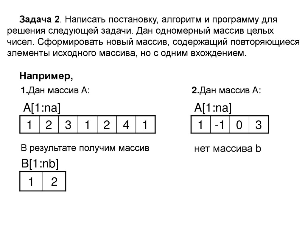 Дано: na-цел, a[1:na]-цел.Результат: b[1:nb]-цел,или сообщение “нет массива