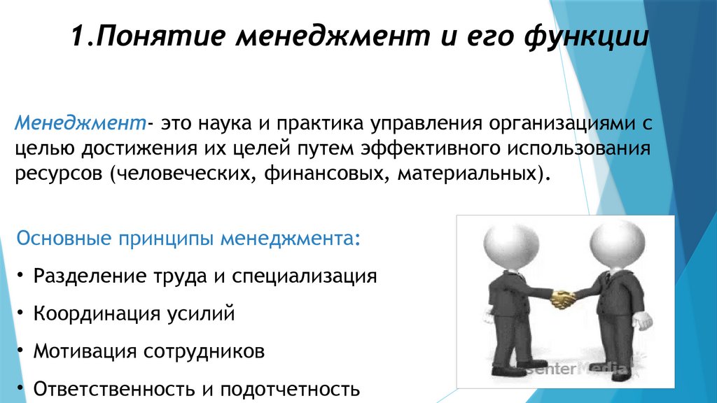 1.Понятие менеджмент и его функцииМенеджмент- это наука и практика управления организациями с