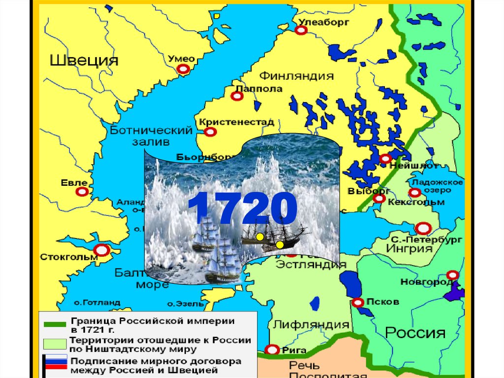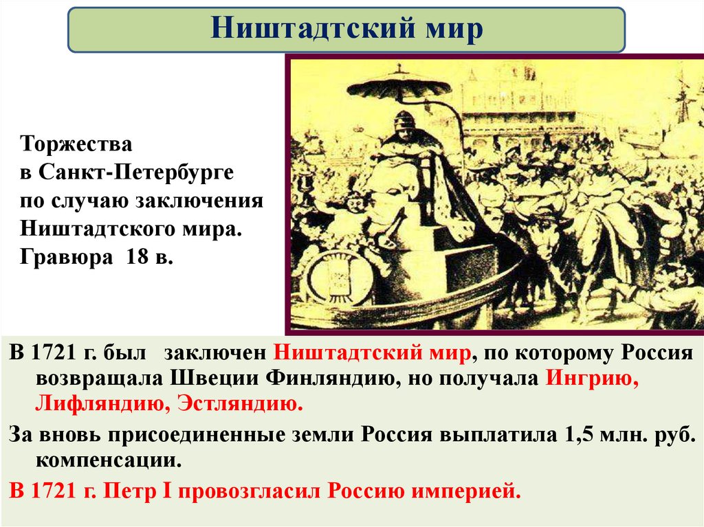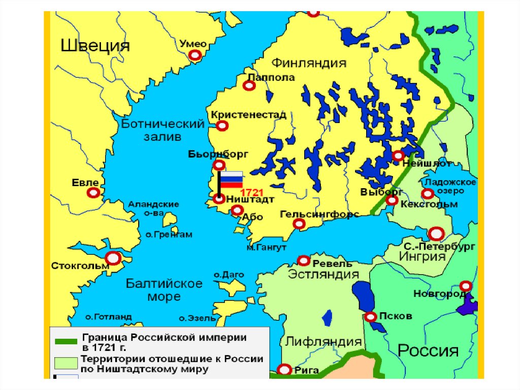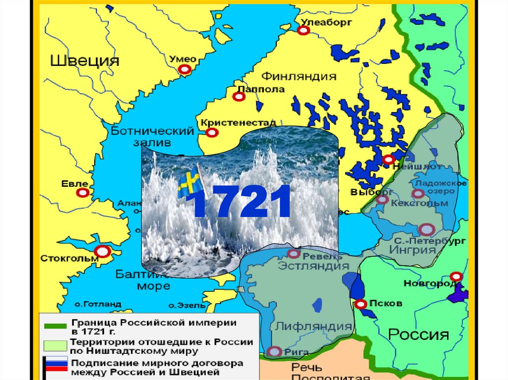 В 1721 г. был заключен Ништадтский мир, по которому Россия