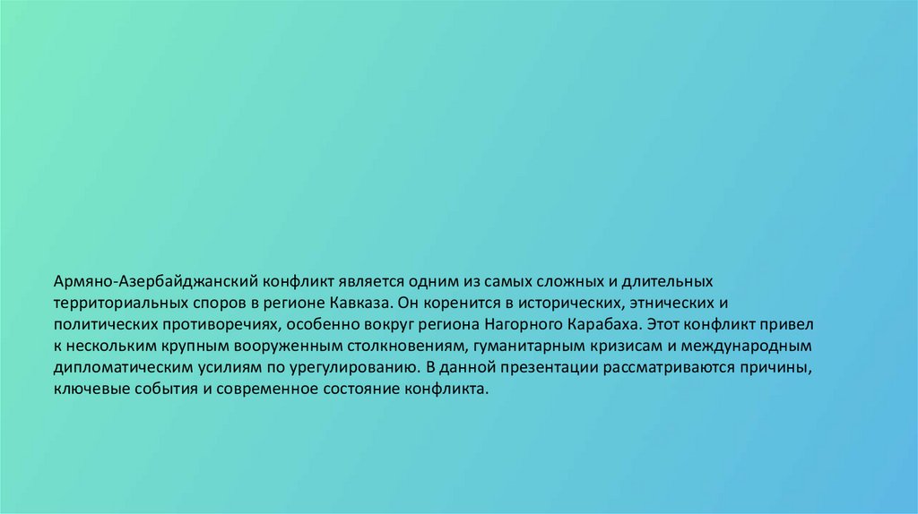 Армяно-Азербайджанский конфликт является одним из самых сложных и длительныхтерриториальных споров в регионе Кавказа. Он коренится в исторических, этнических и