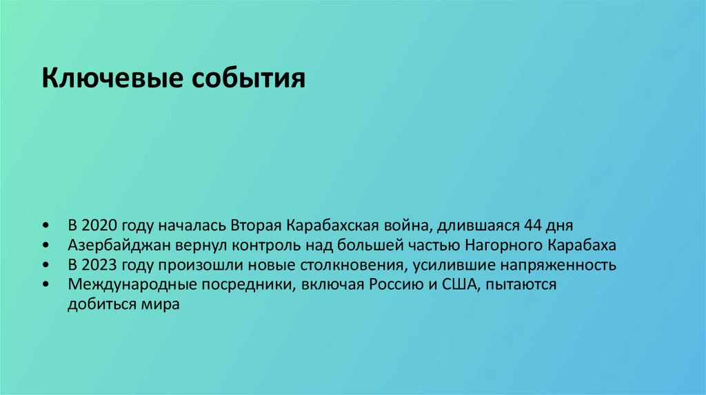 Ключевые событияВ 2020 году началась Вторая Карабахская война, длившаяся 44 дня