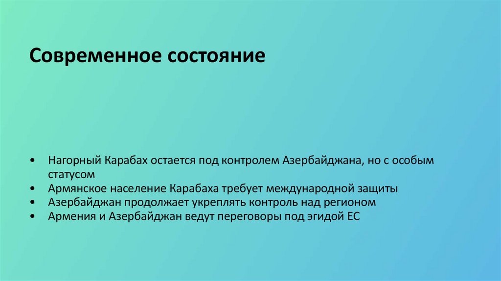 Современное состояниеНагорный Карабах остается под контролем Азербайджана, но с особым