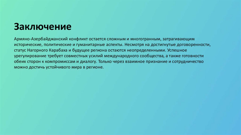 ЗаключениеАрмяно-Азербайджанский конфликт остается сложным и многогранным, затрагивающим