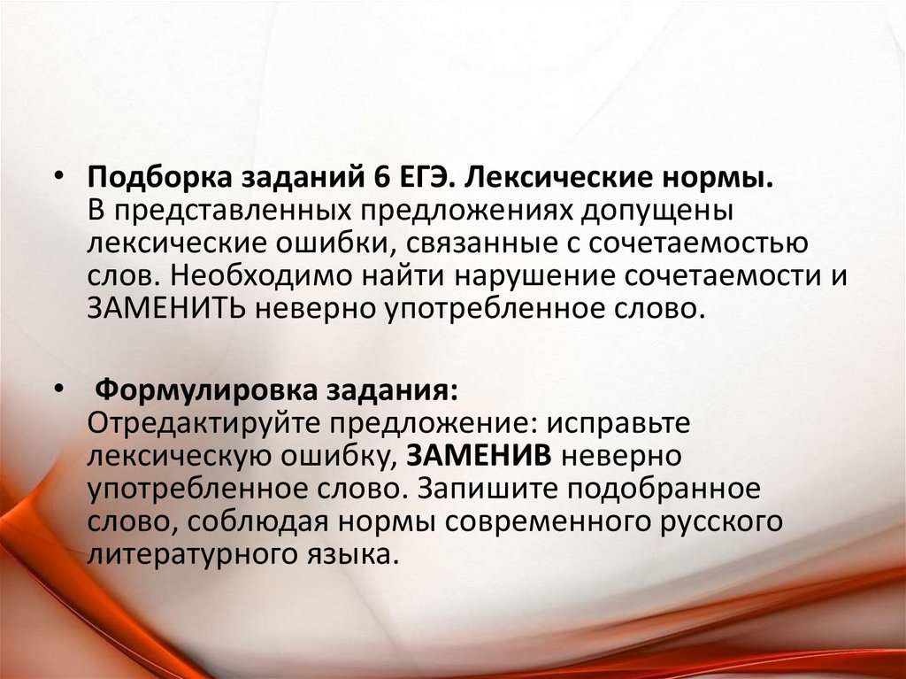 • Подборка заданий 6 ЕГЭ. Лексические нормы.В представленных предложениях допущены