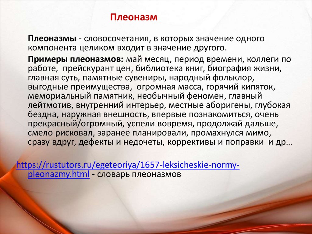 Примеры плеоназмов: май месяц, период времени, коллеги по
