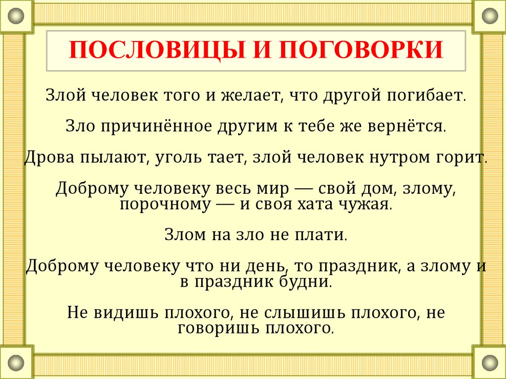 ПОСЛОВИЦЫ И ПОГОВОРКИЗлой человек того и желает, что другой погибает.