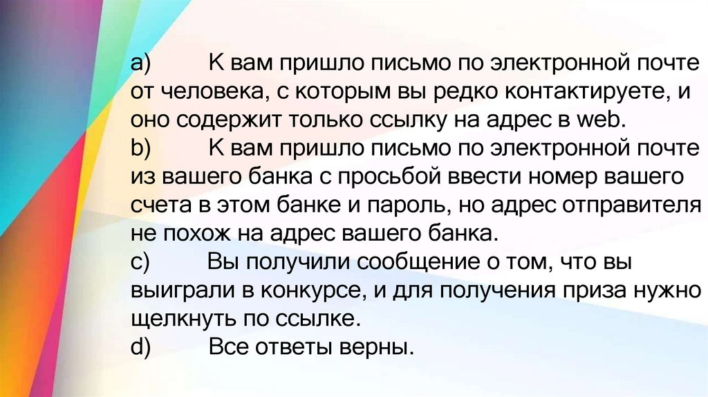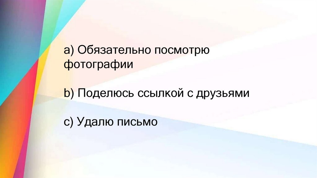 2. Вам пришло письмо: «Новые снимки на сервере Яндекс.Фотки.Открой и увидишь! www.fotoyandex11234.ru». Как вы поступите?