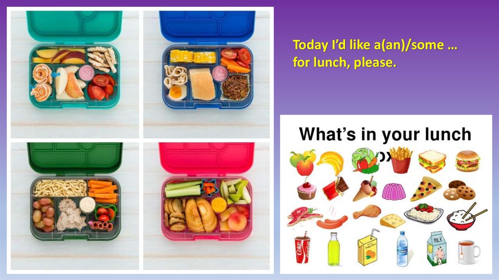 Today I’d like a(an)/some …for lunch, please.