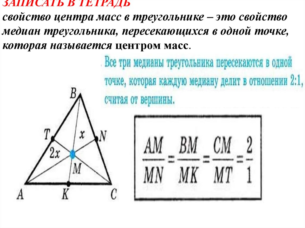 ЗАПИСАТЬ В ТЕТРАДЬсвойство центра масс в треугольнике – это свойство