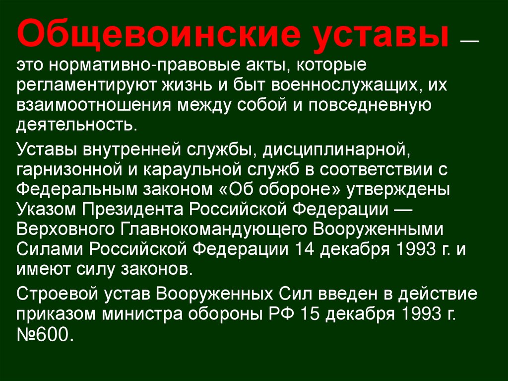 Общевоинские уставы —это нормативно-правовые акты, которые