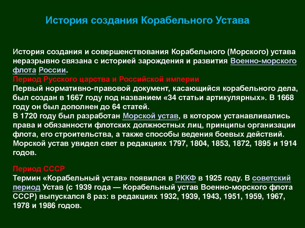История создания Корабельного УставаИстория создания и совершенствования Корабельного (Морского) устава