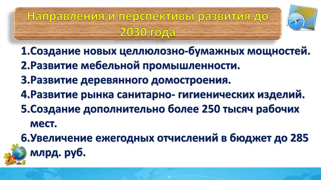 1.Создание новых целлюлозно-бумажных мощностей.2.Развитие мебельной промышленности.