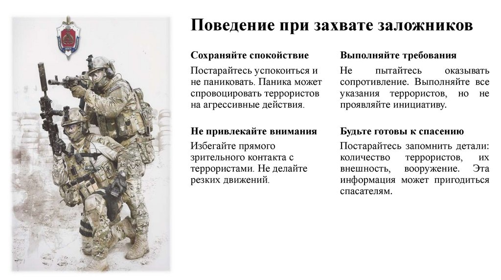 пытайтесь бежать или помогать спецназу.