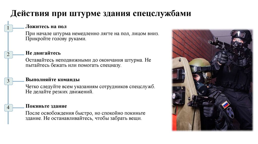 При начале штурма немедленно лягте на пол, лицом вниз.