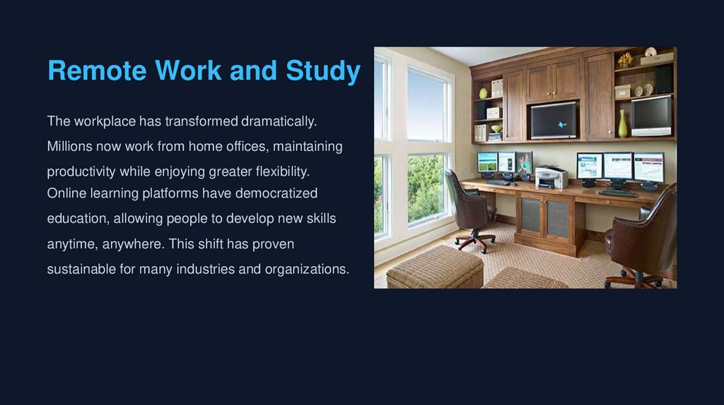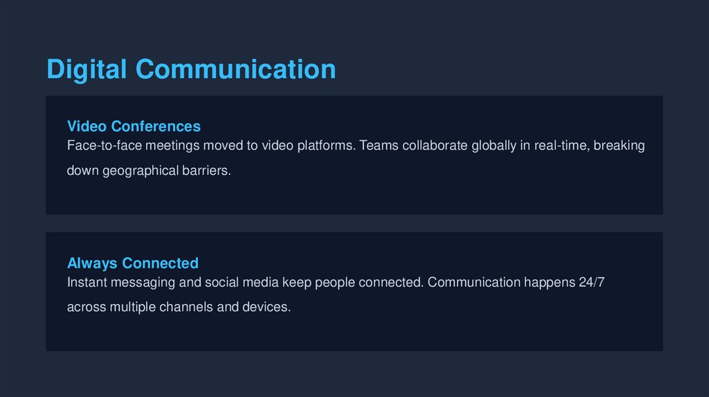 Face-to-face meetings moved to video platforms. Teams collaborate globally in real-time, breaking