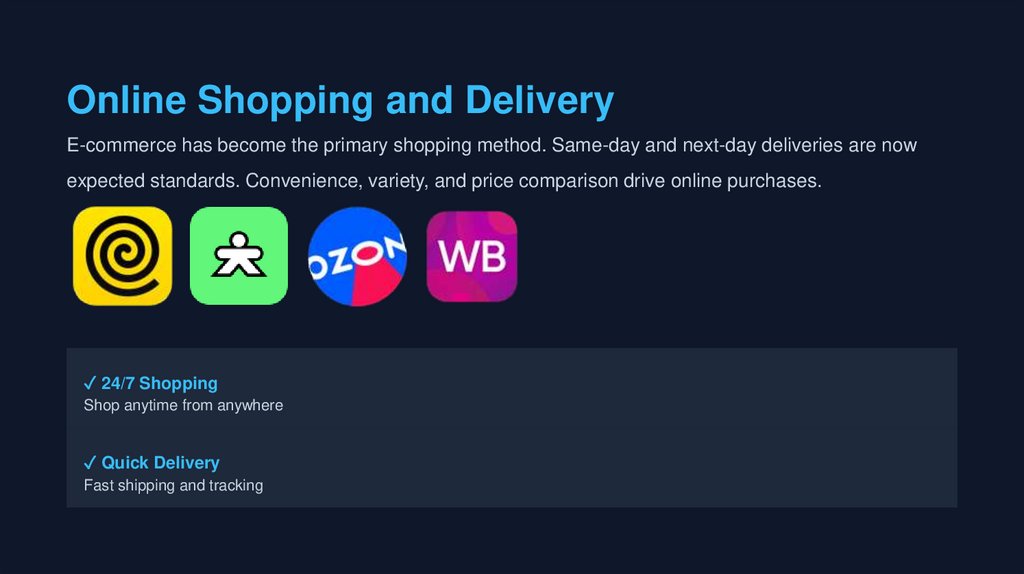 Online Shopping and DeliveryE-commerce has become the primary shopping method. Same-day and next-day deliveries are now
