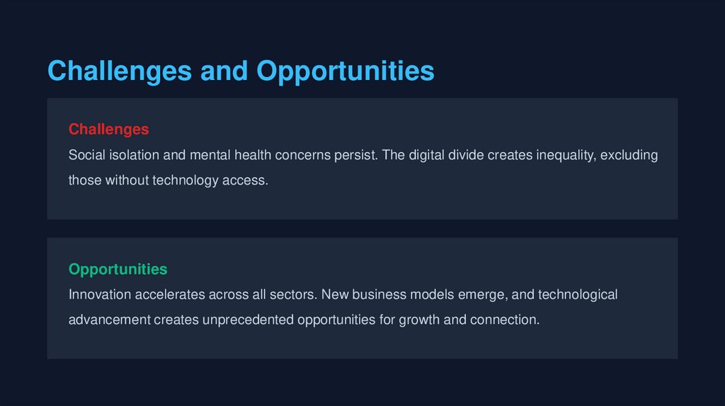 Social isolation and mental health concerns persist. The digital divide creates inequality, excluding