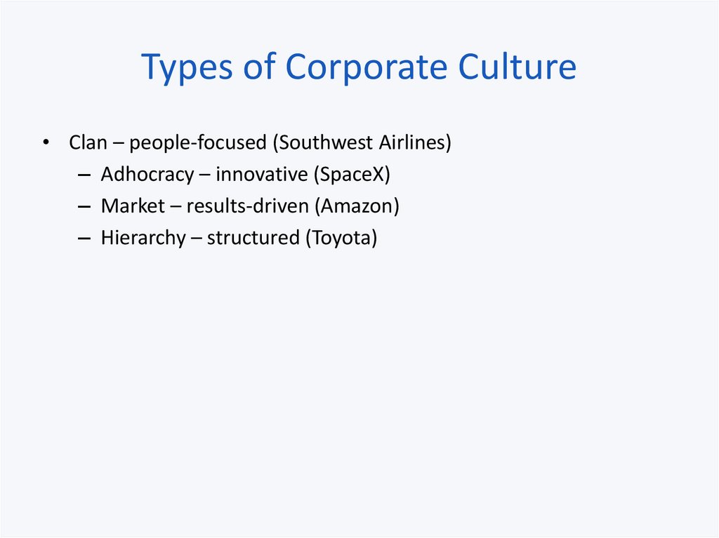 Types of Corporate Culture• Clan – people-focused (Southwest Airlines)