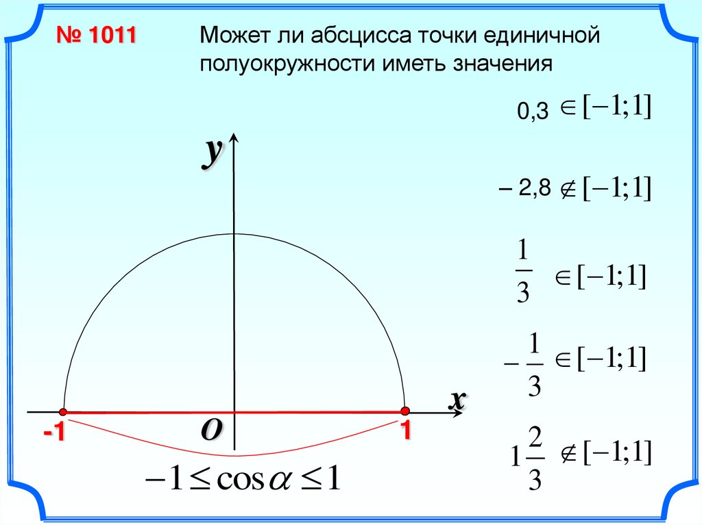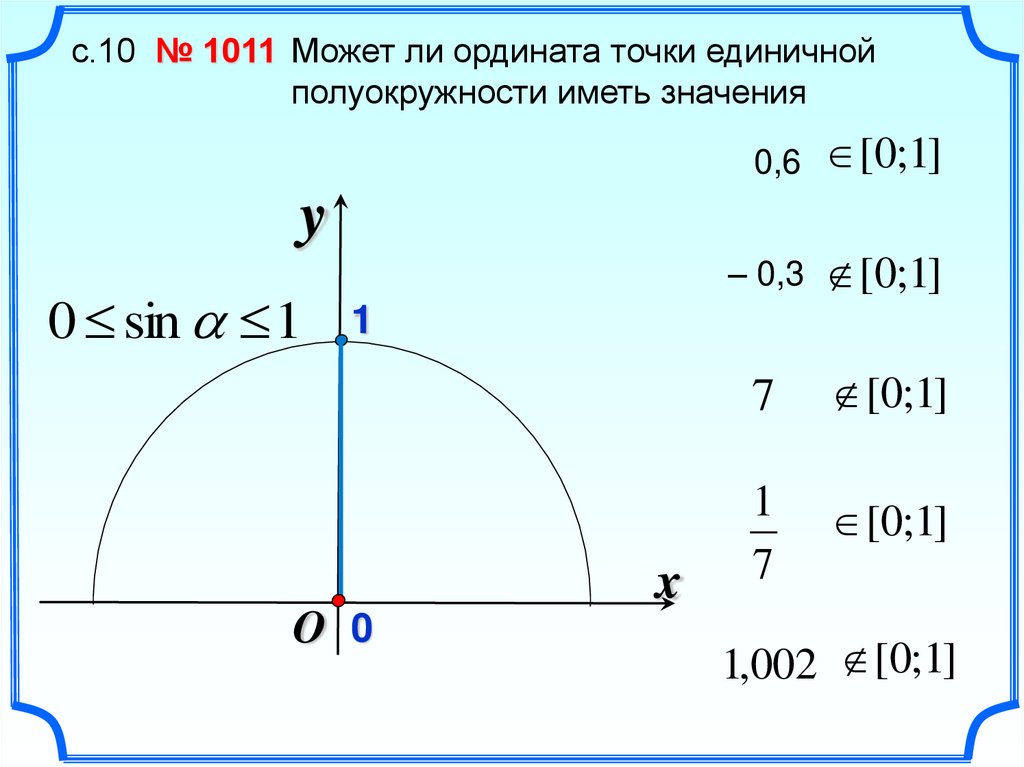 с.10 № 1011 Может ли ордината точки единичнойполуокружности иметь значения
