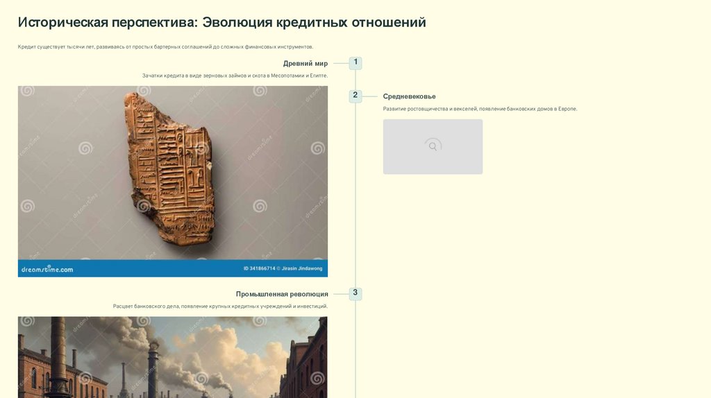 Историческая перспектива: Эволюция кредитных отношенийКредит существует тысячи лет, развиваясь от простых бартерных соглашений до сложных финансовых инструментов.