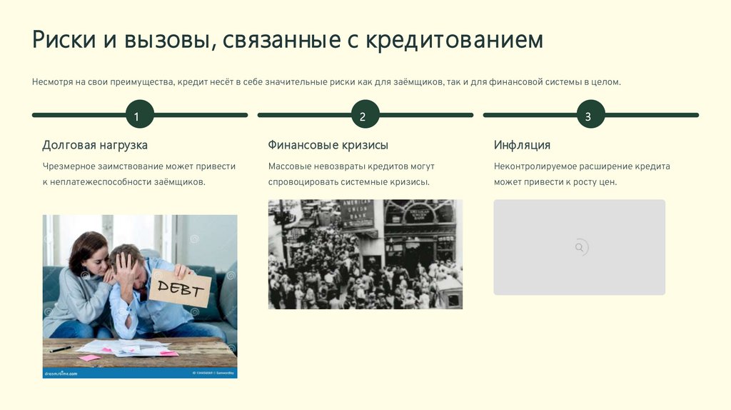 Риски и вызовы, связанные с кредитованиемНесмотря на свои преимущества, кредит несёт в себе значительные риски как для заёмщиков, так и для финансовой системы в целом.