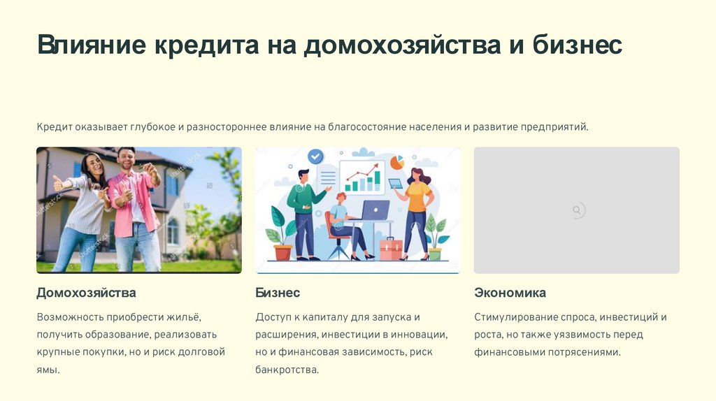 Влияние кредита на домохозяйства и бизнесКредит оказывает глубокое и разностороннее влияние на благосостояние населения и развитие предприятий.
