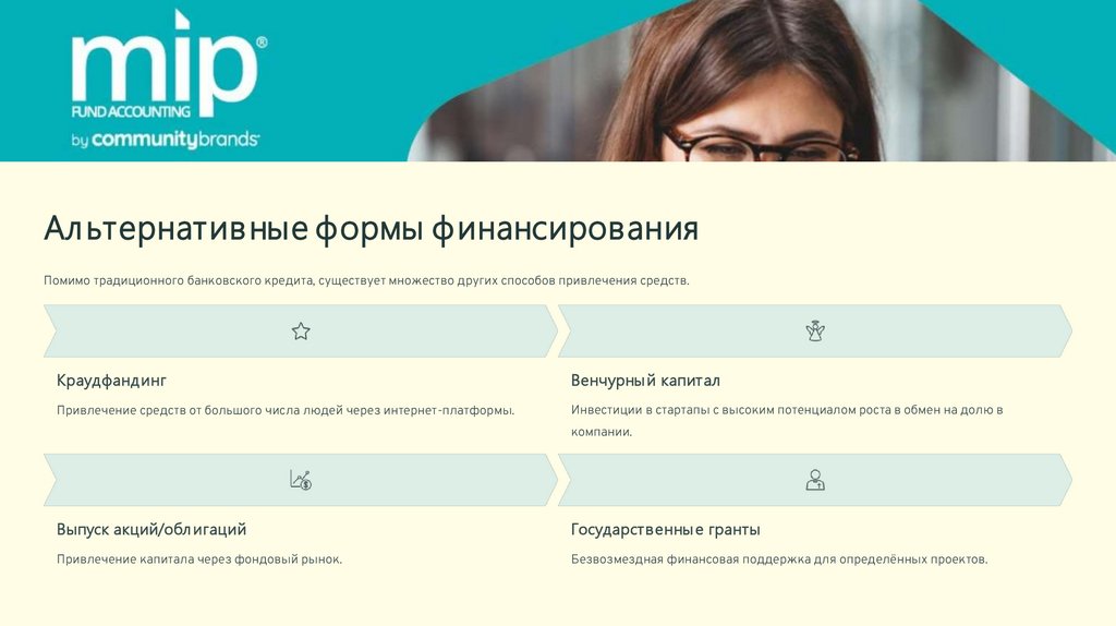 Ал ьтернатив ные формы финансированияПомимо традиционного банковского кредита, существует множество других способов привлечения средств.