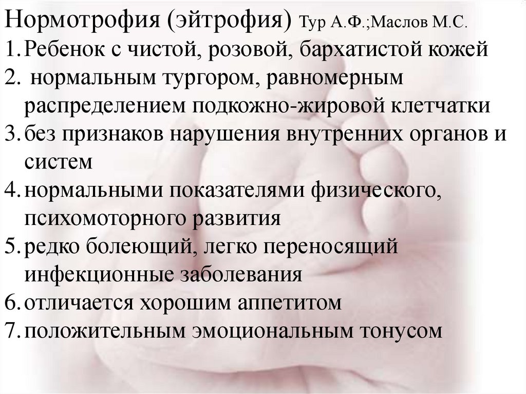Нормотрофия (эйтрофия) Тур А.Ф.;Маслов М.С.1.Ребенок с чистой, розовой, бархатистой кожей