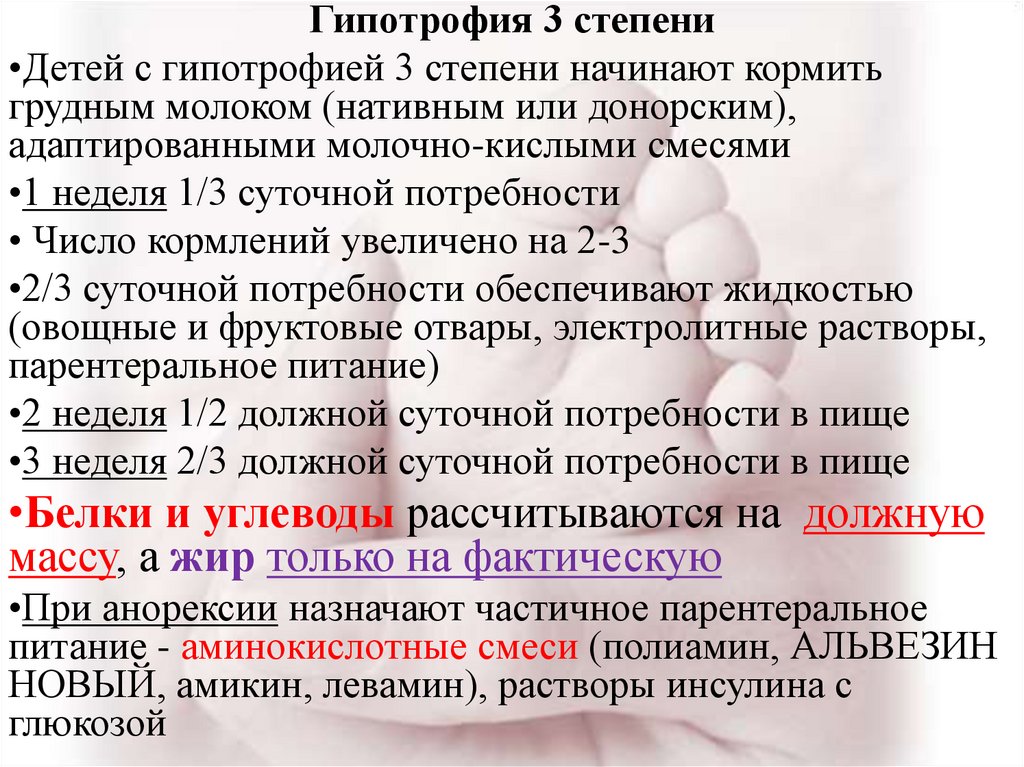 дефицит массы тела = 9400 — 6900 = 2500 = 26% (9400 100%, а 2500 – х. 2500 х100 / 9400 = 26%). Диагноз: