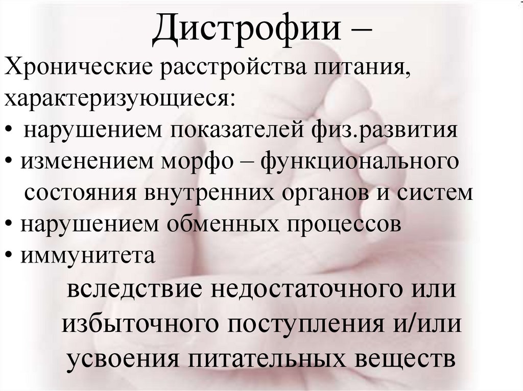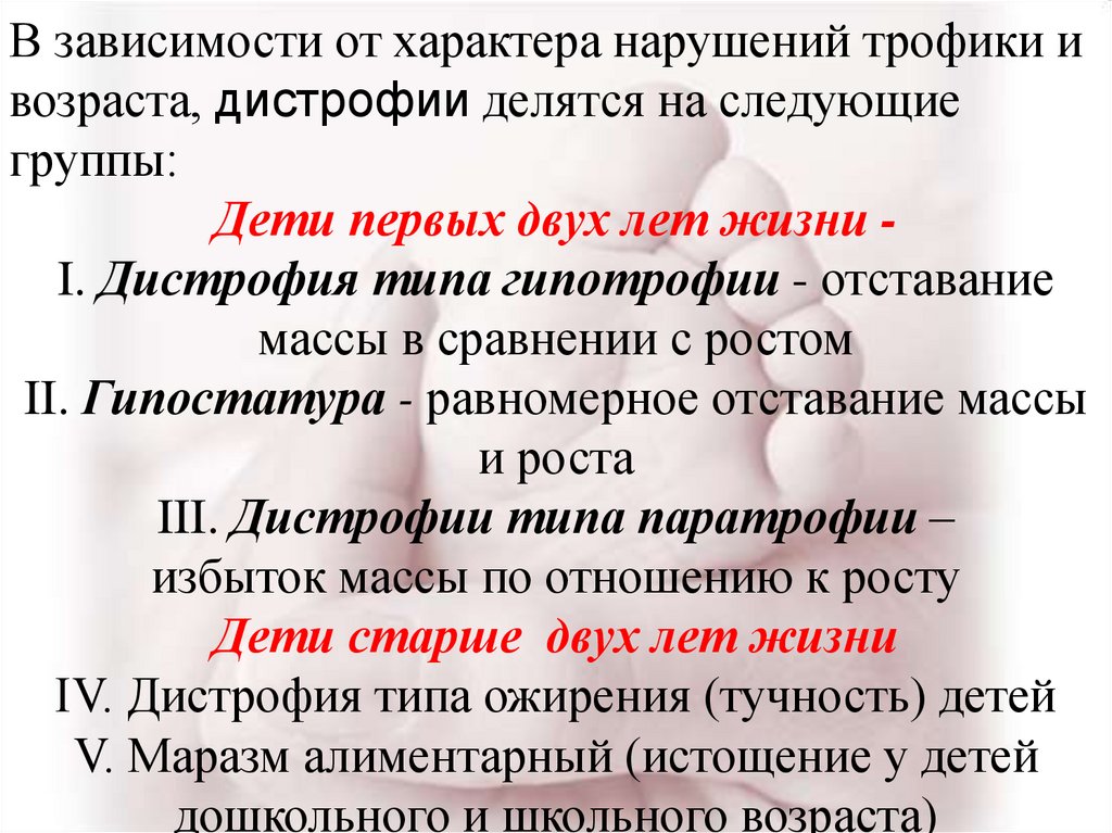 В зависимости от характера нарушений трофики ивозраста, дистрофии делятся на следующие