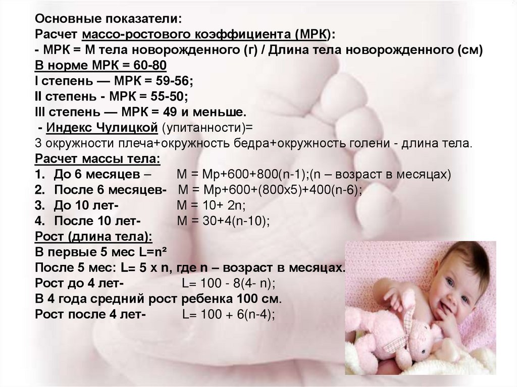- МРК = М тела новорожденного (г) / Длина тела новорожденного (см)
