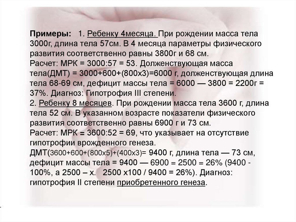 Примеры: 1. Ребенку 4месяца. При рождении масса тела3000г, длина тела 57см. В 4 месяца параметры физического