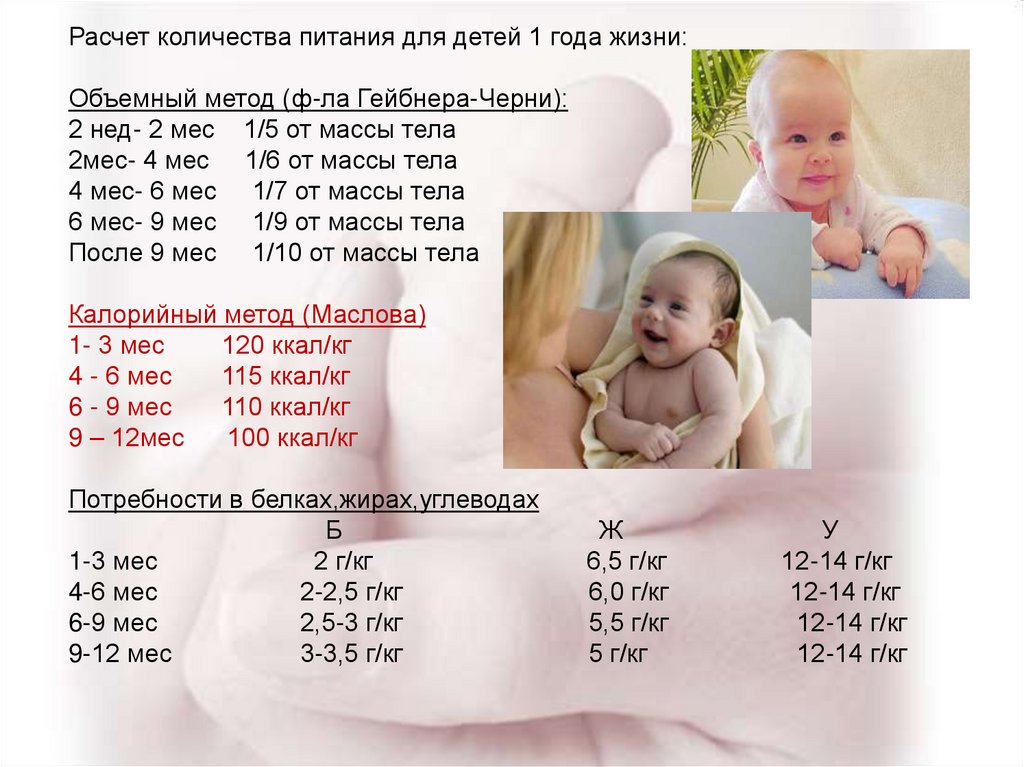 Расчет количества питания для детей 1 года жизни:Объемный метод (ф-ла Гейбнера-Черни):
