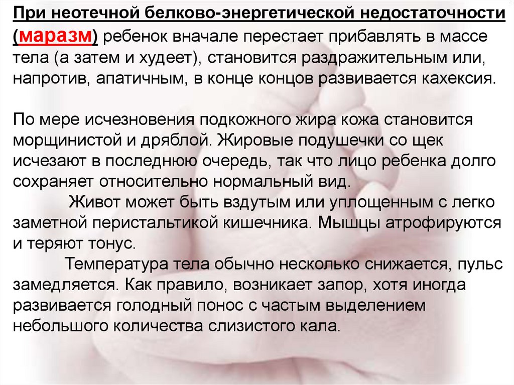 При неотечной белково-энергетической недостаточности(маразм) ребенок вначале перестает прибавлять в массе