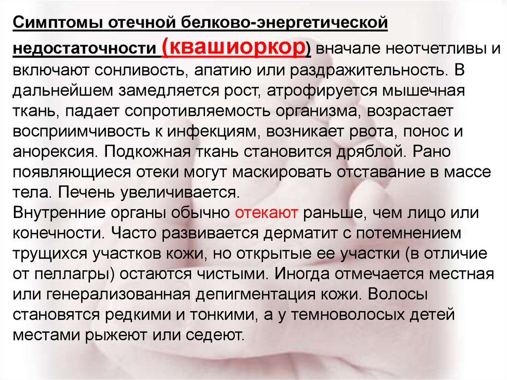 Симптомы отечной белково-энергетическойнедостаточности (квашиоркор) вначале неотчетливы и