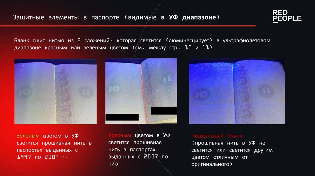 цветов на всех страницах паспорта (в УФ диапазоне);