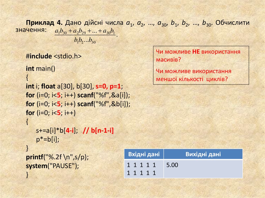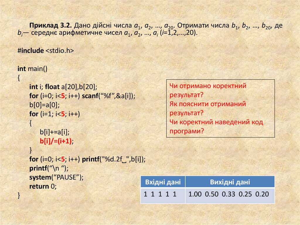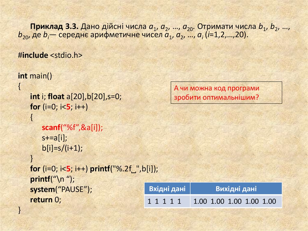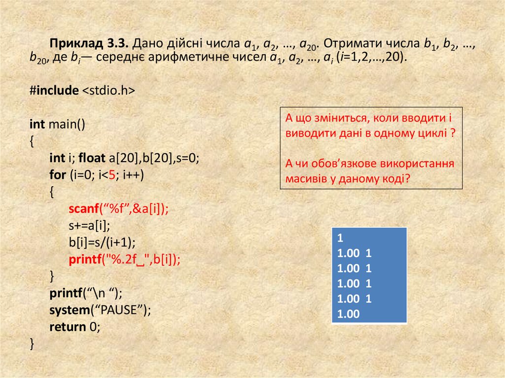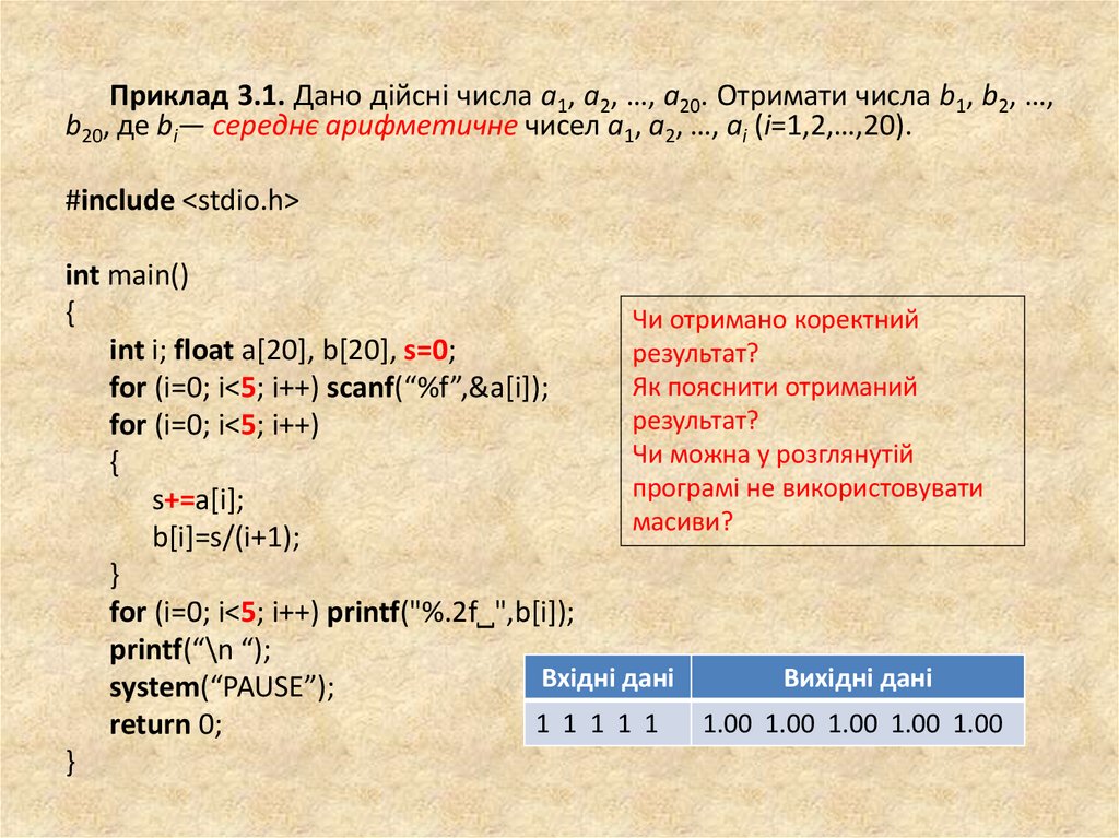 Приклад 3.1. Дано дійсні числа a1, a2, …, a20. Отримати числа b1, b2, …,b20, де bi— середнє арифметичне чисел a1, a2, …, aі (i=1,2,…,20).