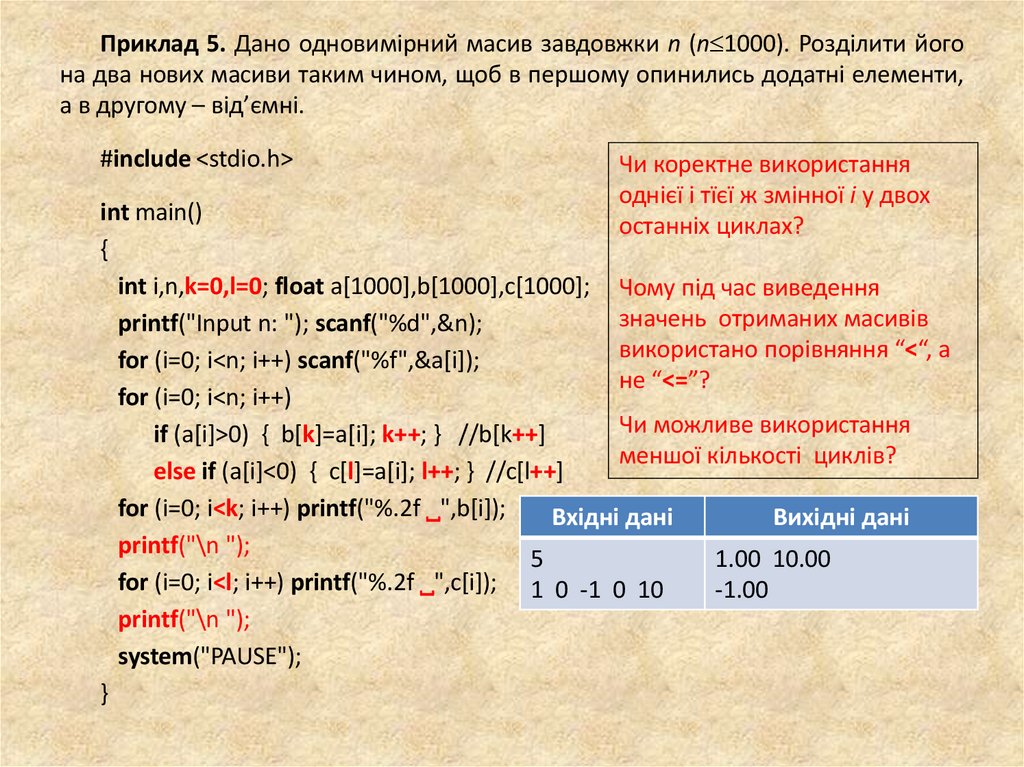 Приклад 5. Дано одновимірний масив завдовжки n (n 1000). Розділити йогона два нових масиви таким чином, щоб в першому опинились додатні елементи,